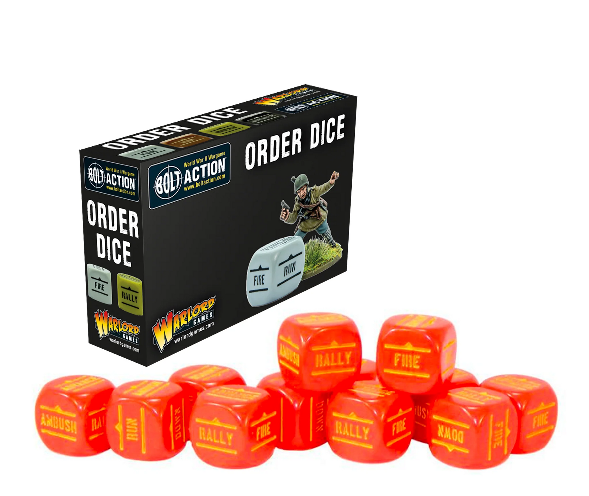 Bolt Action utilises a random unit activation system using Order Dice. Each player will need one set of Orders Dice in a different colour to that of their opponent.