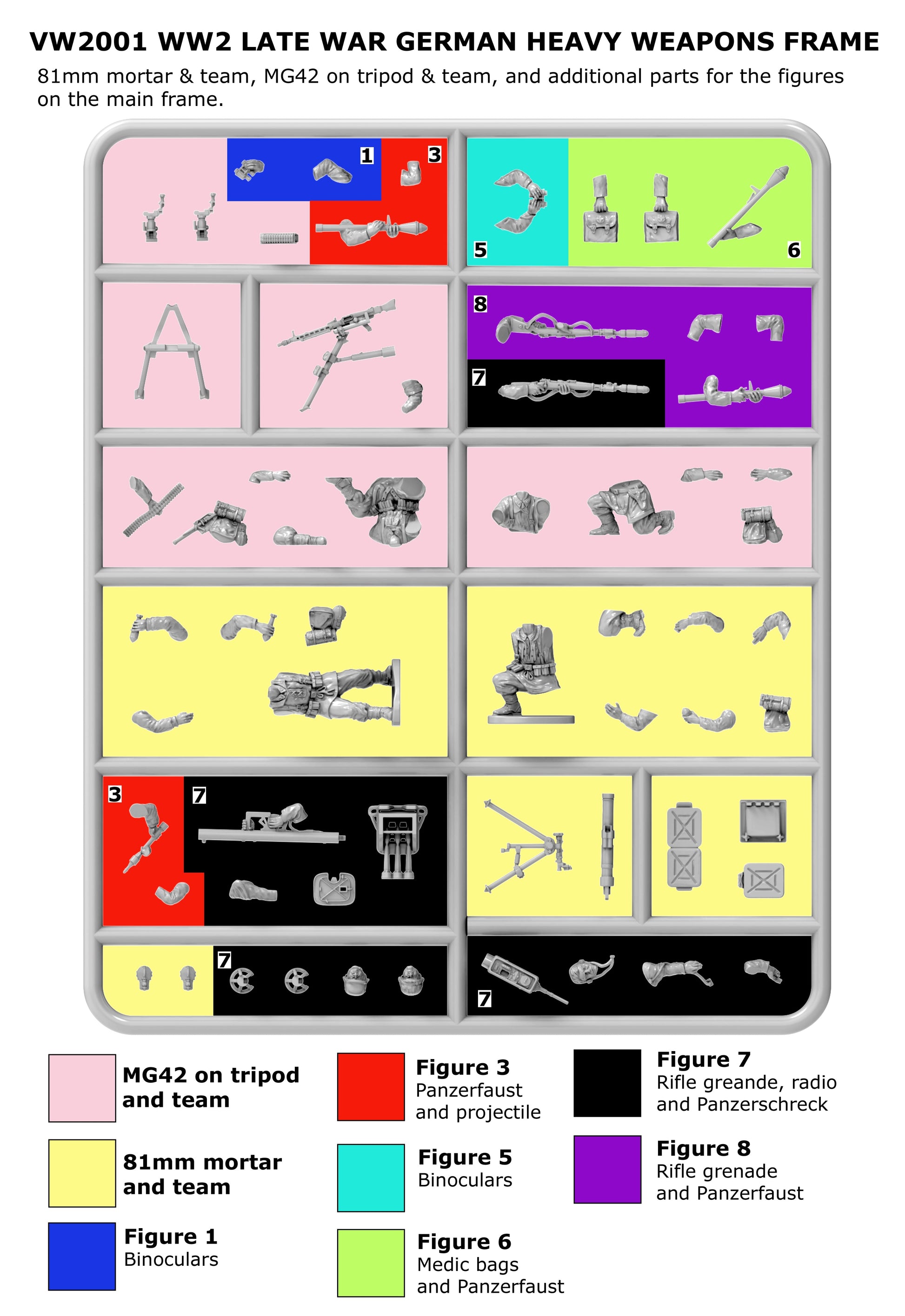 Every figure in your platoon can be made differently as we have provided a lot of arm and head options for you to choose from. There are plenty of MG42’s and a good selection of MP40’s and StG 44’s. Separate stick grenades and hands holding stick grenades are included so any figure can be converted with these items.